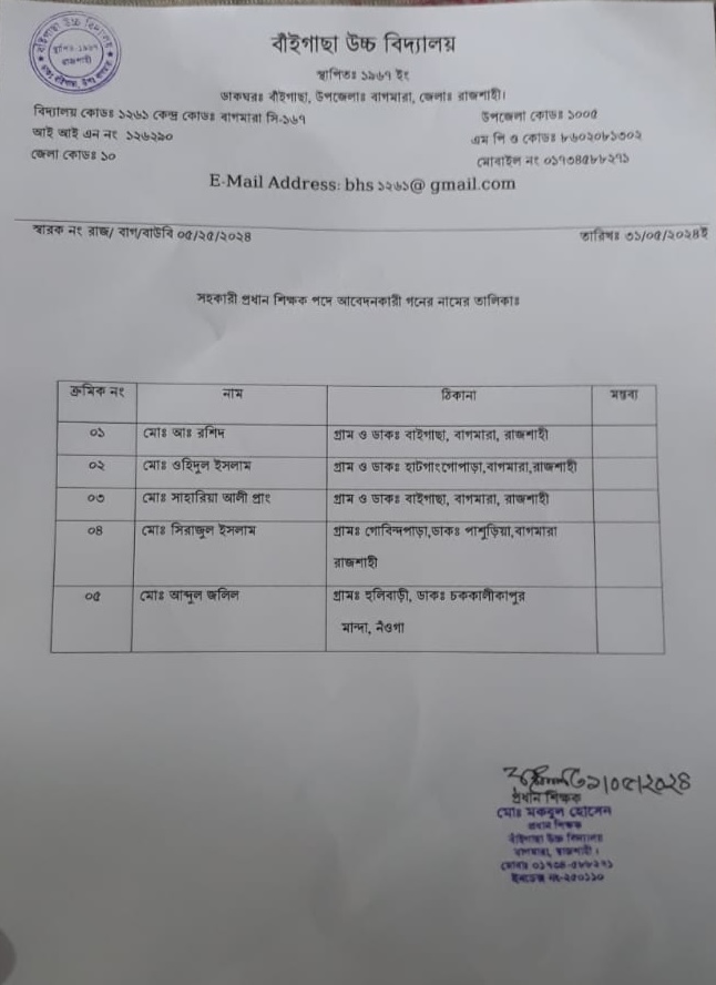 সহকারী প্রধান শিক্ষক পদে আবেদনকারী গণের নামের তালিকা প্রকাশ… Posted on June 1, 2024 by Baigacha High School